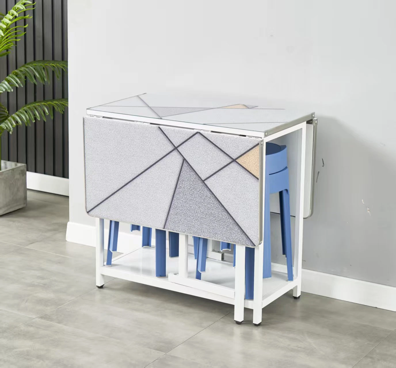 Smartly designed for compact living, this foldable space-saving dining table transforms from a full dining setup into a neat, compact unit when not in use. The stylish geometric glass tabletop folds down smoothly, while all four stools store securely inside the table frame—keeping your space clutter-free.